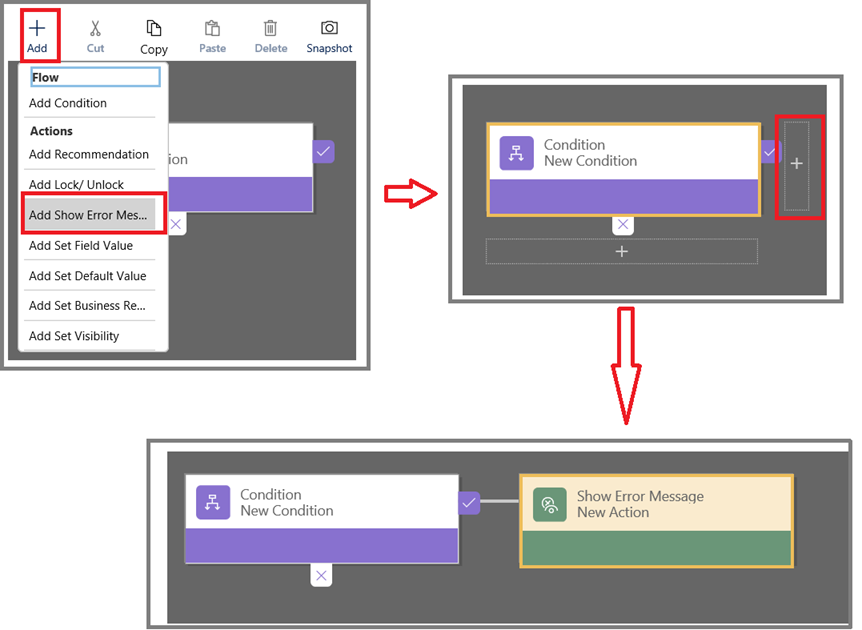 Click on Add -> Add Show Error Message. It will display plus sign near condition success and failure. Click on the + sign near positive condition